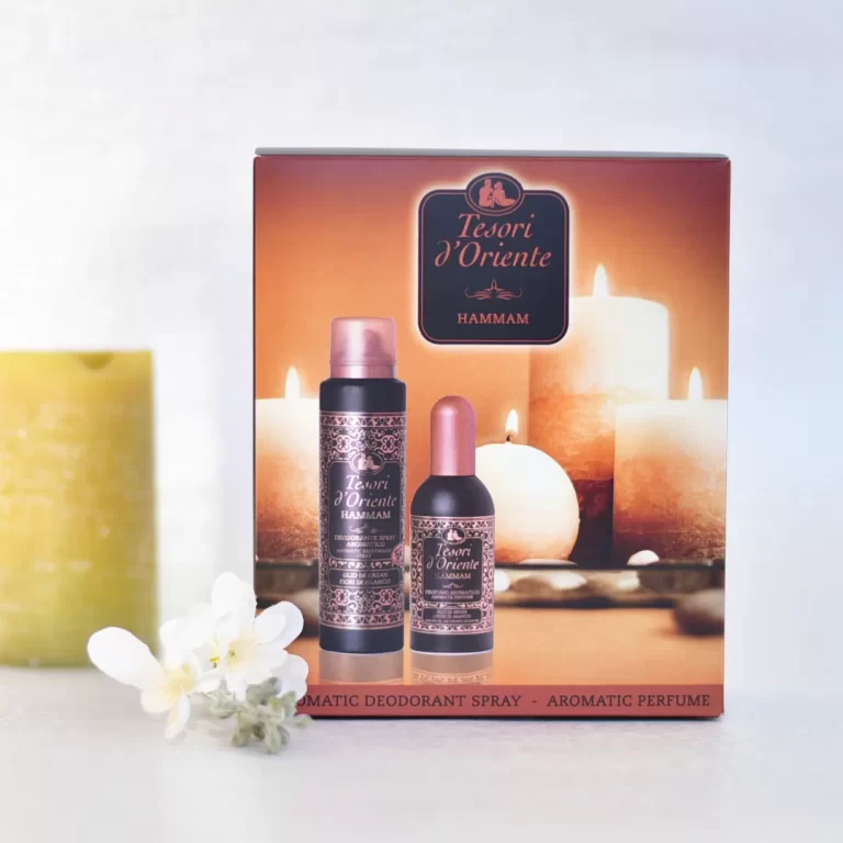 Hammam set krije dezodorans i parfem koji spaja senzualnost jasmina, svjetlinu cvijeta naranče i svježinu klementine.